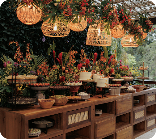 A gastronomia não faz parte do orçamento. Trabalhamos com buffets parceiros, com preços variados, dependendo do que vocês decidirem servir no evento.